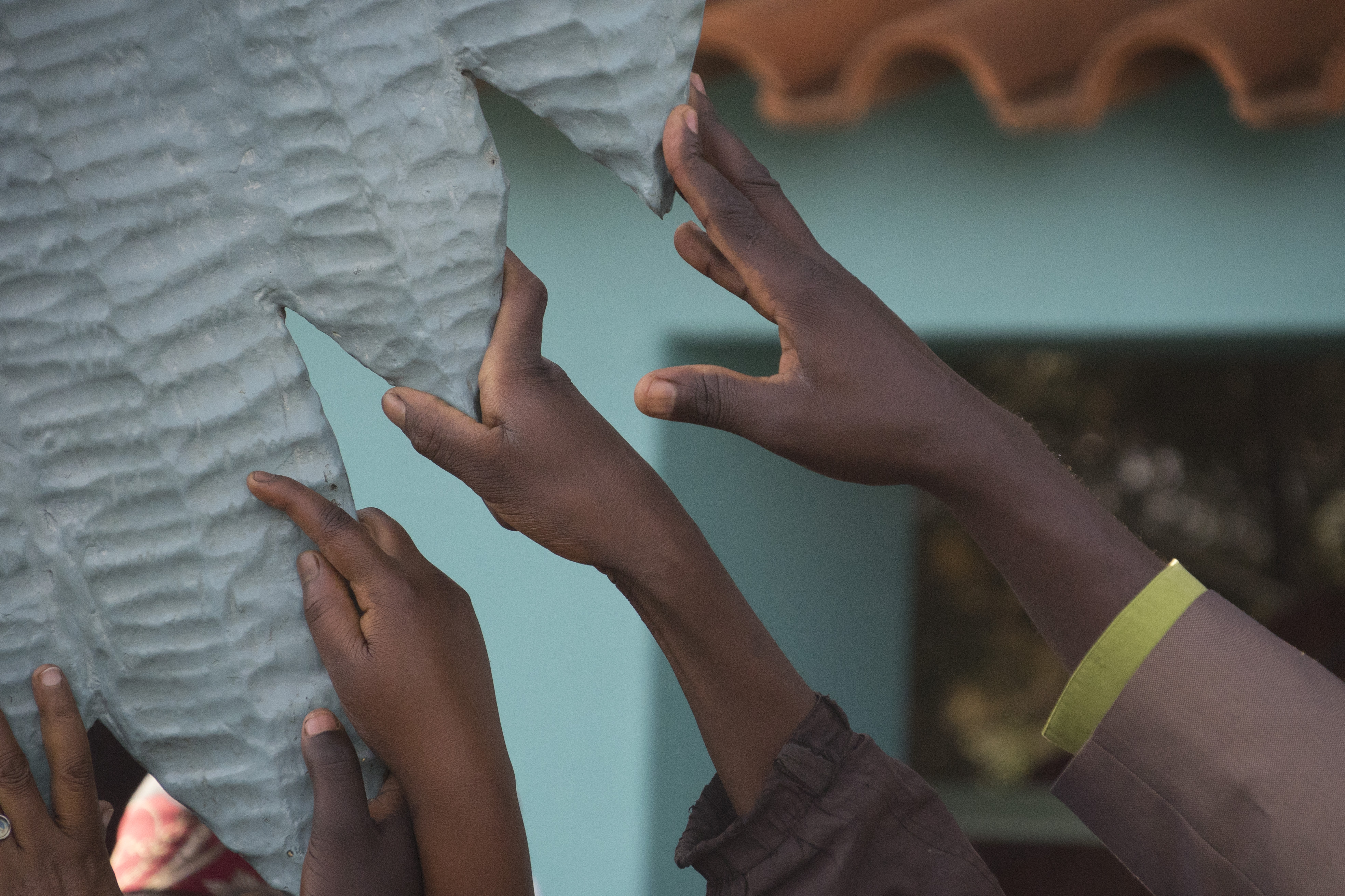People reaching out to touch the Divine Mercy statue.