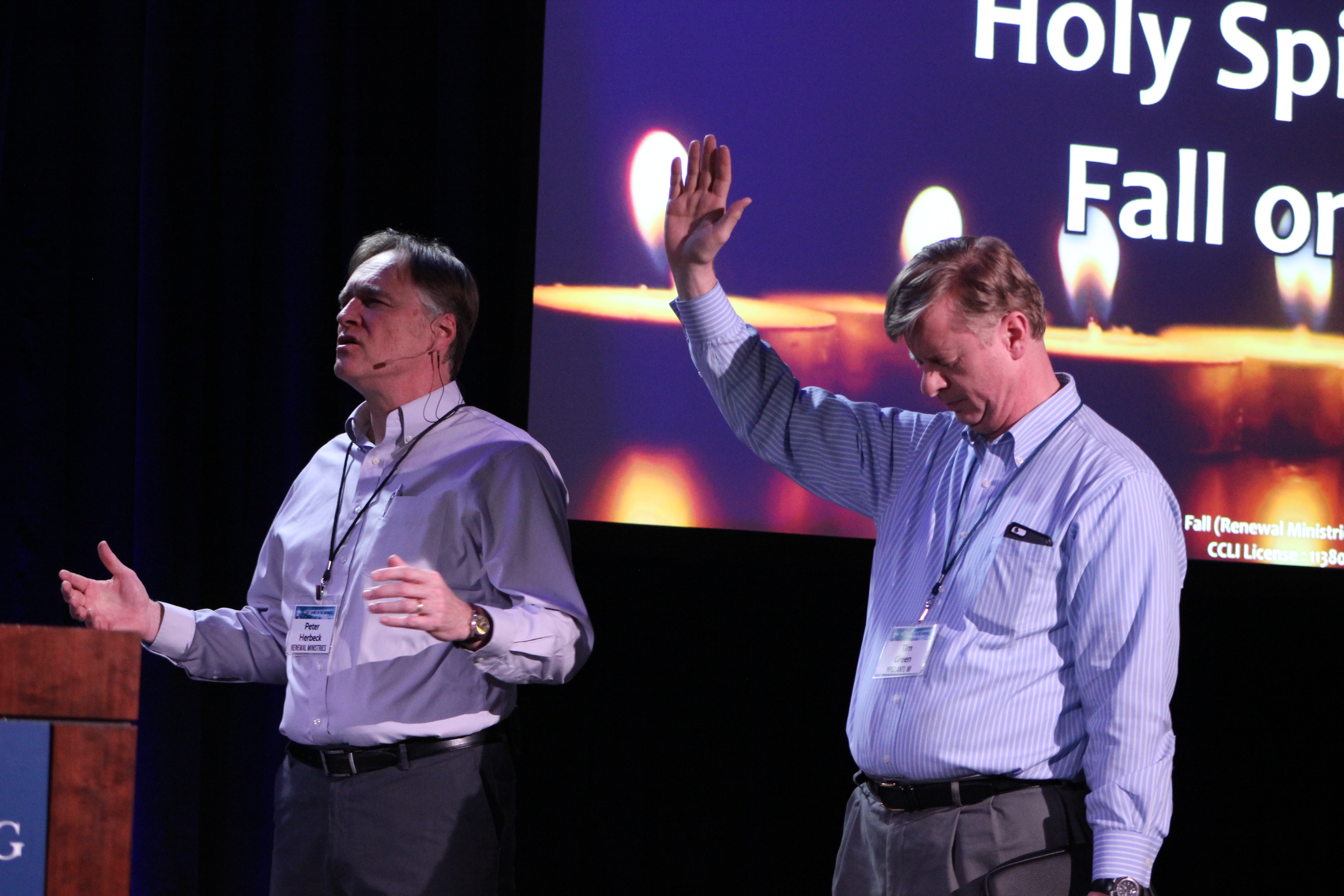 Peter Herbeck and Tim Green pray at the 2017 Gathering.